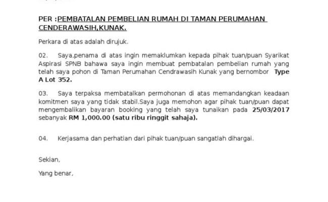 Contoh surat permohonan kerjasama kredit perumahan rakyat. Contoh surat penolakan permohonan pembiayaan kpr dari bsm from blog.rivaekaputra.com perumahan contoh surat pembatalan pembelian rumah. Contoh surat permohonan kerjasama kredit perumahan rakyat. Uang yang telah kami bayarkan adalah:. Download contoh surat pembatalan perjanjian jual beli rumah png. Sebelum kita menyentuh tentang surat pembatalan pinjaman perumahan lppsa ni aku nak menyorot sedikit sebanyak permulaan cerita sebelum tindakan . Bila pemohon kpr ditolak oleh bank pemberi kredit lembaga keuangan, makabooking fee . Contoh surat permohonan pembatalan pinjaman rumah lppsa cute766. Dengan ini menyatakan pembatalan pembelian 1 unit rumah blok …. Dengan ini menyatakan pembatalan pembelian rumah di perumahan citra indah.